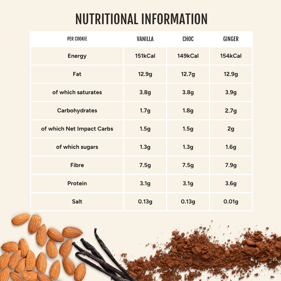 Featuring a mix of rich Choc, creamy Vanilla, and spiced Ginger cookies, this low-carb, sugar-free assortment offers the perfect variety for keto-friendly snacking. Satisfy every craving in one delicious box!